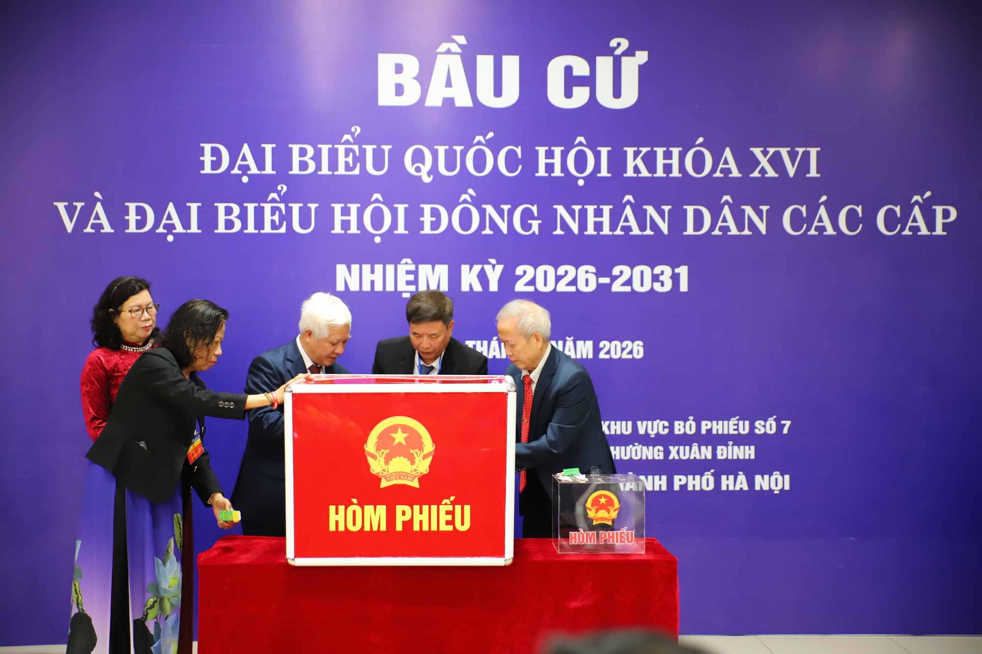 Dự lễ khai mạc và thực hiện bỏ phiếu tại khu vực bỏ phiếu số 7, phường Xuân Đỉnh có Uỷ viên Bộ Chính trị, Bí thư Trung ương Đảng, Chủ tịch Uỷ ban Trung ương MTTQ Việt Nam Bùi Thị Minh Hoài - Phó Chủ tịch Hội đồng Bầu cử Quốc gia; Chủ tịch Hội đồng Lý luận Trung ương Nguyễn Xuân Thắng; Bí thư Trung ương Đảng, Phó Thủ tướng Chính phủ Phạm Thị Thanh Trà; Uỷ viên BCH Trung ương Đảng, Phó Chủ tịch - Tổng Thư ký Uỷ ban Trung ương MTTQ Việt Nam Hà Thị Nga.
