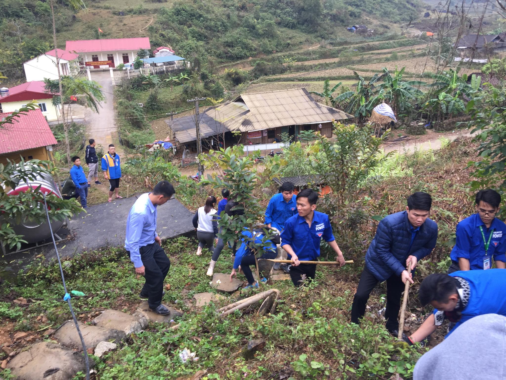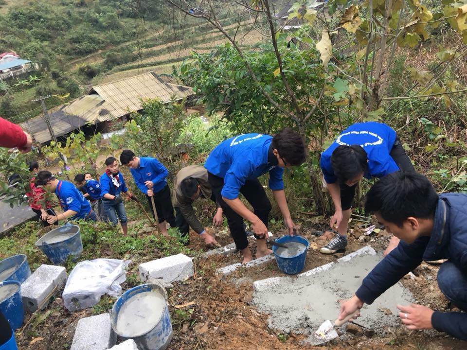 Các Đoàn viên thanh niên Bộ VHTTDL tham gia xây dựng những bậc thang xi măng giúp các em học sinh trường mẫu giáo Triệu Nguyên đi học được an toàn.