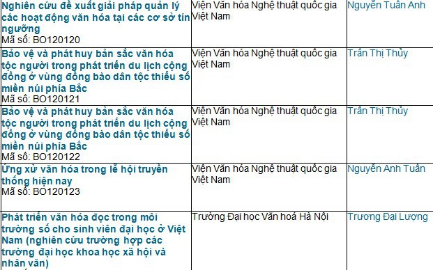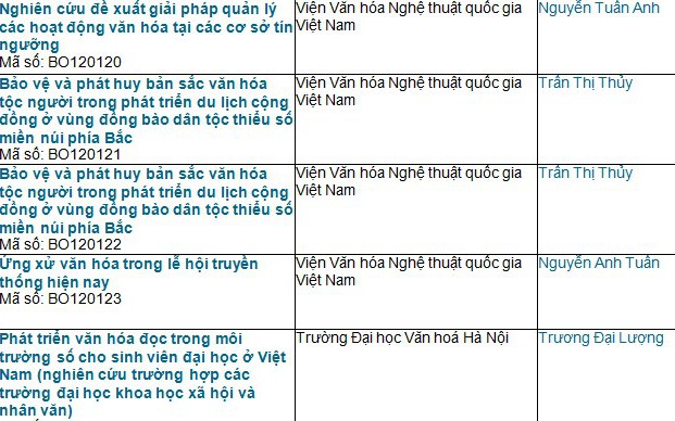 Danh sách các đề tài nghiên cứu khoa học công nghệ (2015-2016)