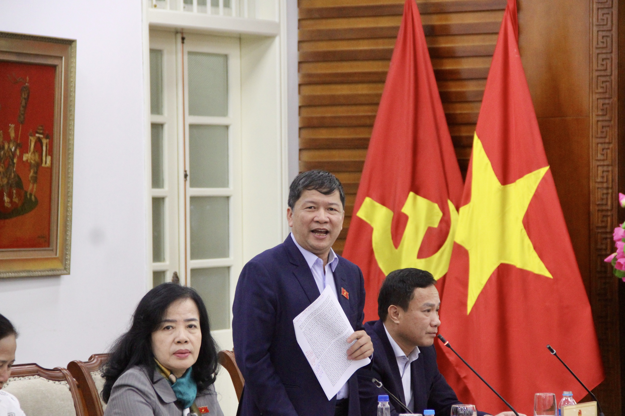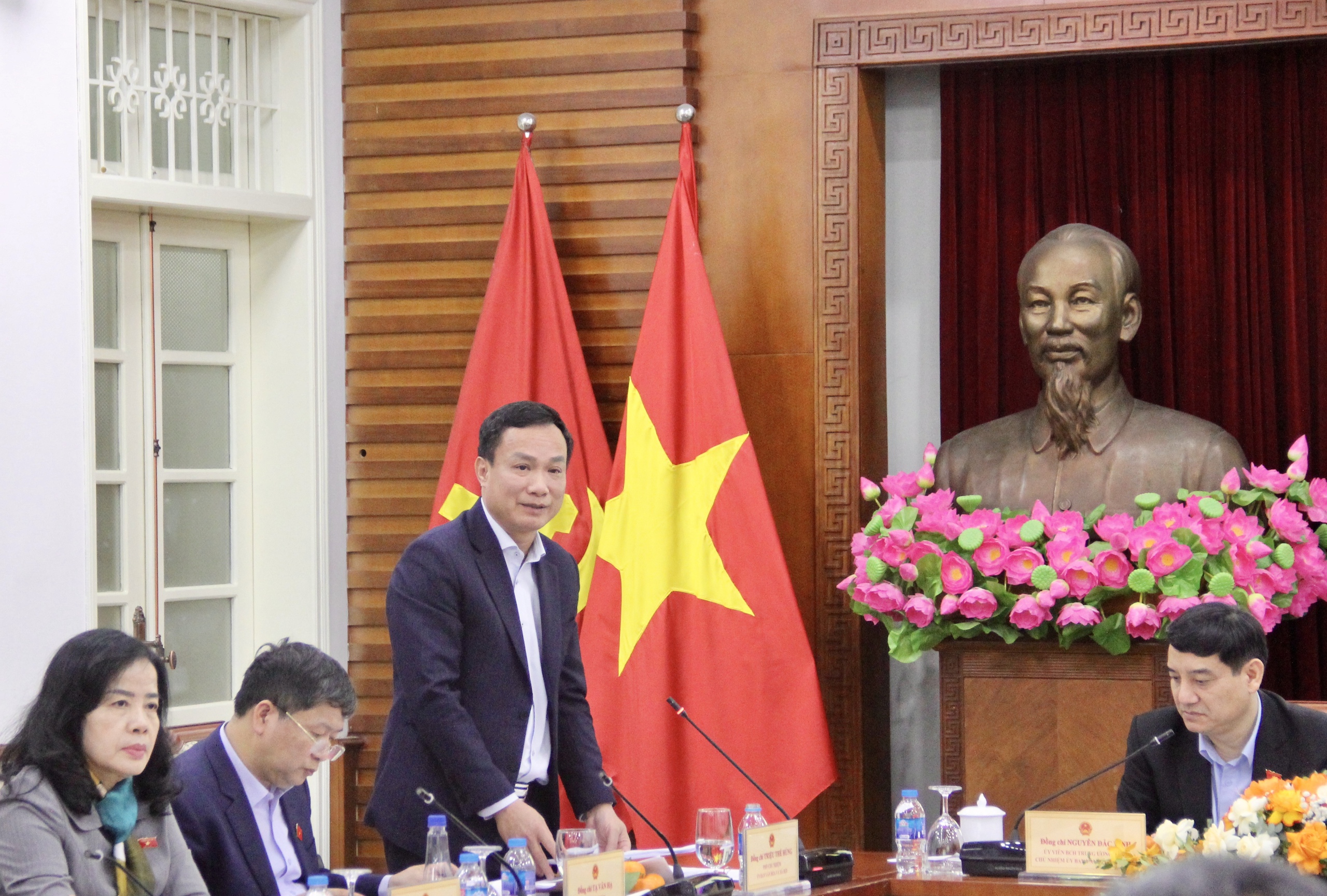 Chủ nhiệm Ủy ban Văn hóa và Xã hội của Quốc hội Nguyễn Đắc Vinh và Bộ trưởng Bộ VHTTDL Nguyễn Văn Hùng đồng chủ trì buổi làm việc.