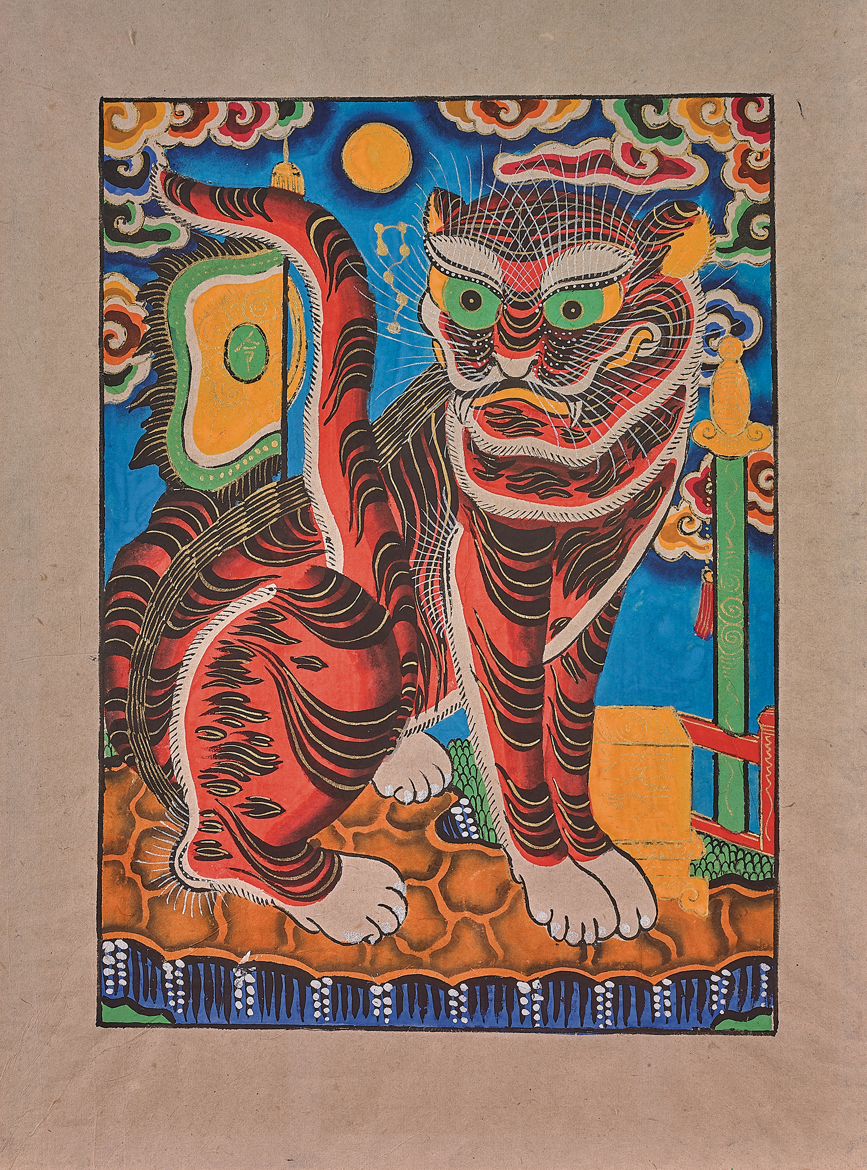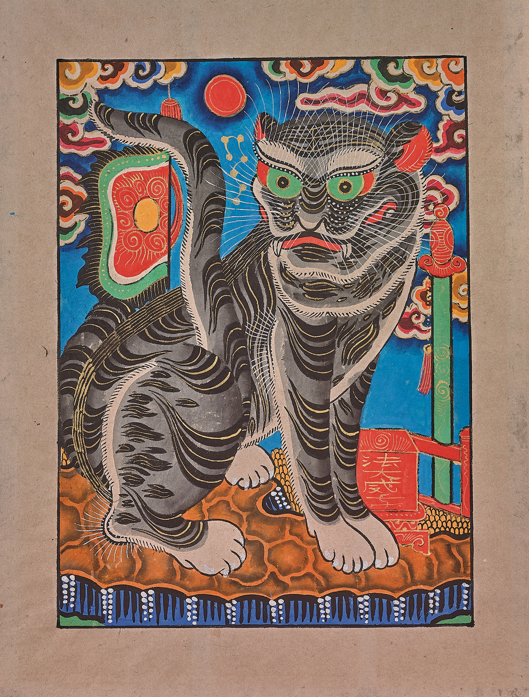 Phần trưng bày “Hổ trong tranh dân gian Hàng Trống” có trưng bày “Ngũ hổ” - bức tranh nổi tiếng được lưu truyền qua nhiều đời trong không gian thờ phụng. Trong tín ngưỡng dân gian, hổ được xem là linh vật có sức mạnh, oai linh, được tôn thờ. Ngoài tranh ngũ hổ còn có các tranh độc hổ theo màu sắc tương ứng: thanh hổ, bạch hổ, xích hổ, hắc hổ.